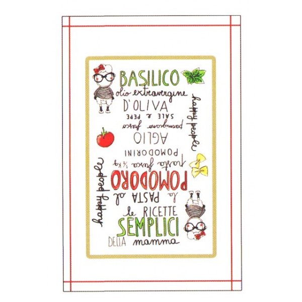 Tovaglia Happy People Collezione Happy Kitchen. Dimensione tovaglia 6 posti cm 150x190 e tovaglia 12 posti cm 150x250 in puro cotone 100%, disponibile con o senza tovaglioli.